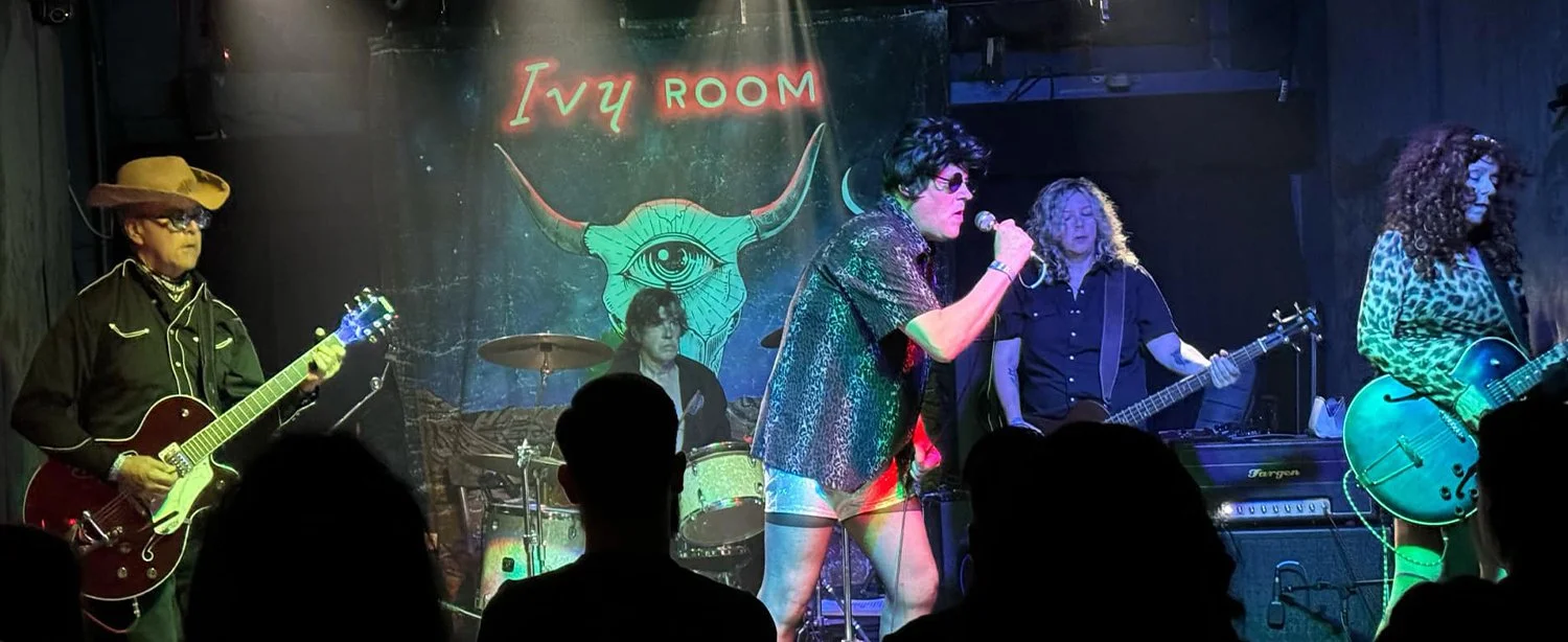 A tribute band to The Cramps, the great psychobilly band with a famous woman guitarist named Poison Ivy. I play rhythm guitar, wear a red wig and scream occasionally. Other players are Lux Inferior, Spleen, John Stuart, and Heather Dammit.